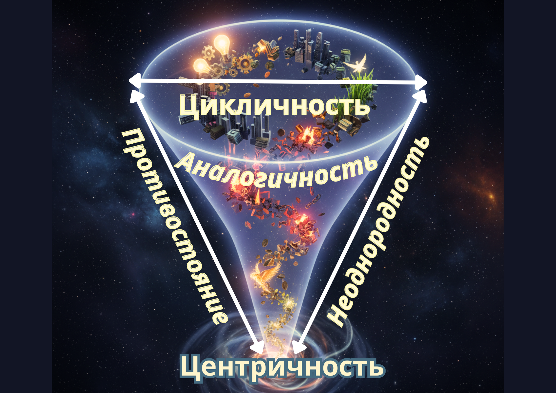 Расширяющаяся воронка (треугольник, перевёрнутый основанием вниз) засасывает и захватывает в свои объятия большее количество окружающего пространства. Во главе системе возвышается ИДЕЯ, вокруг которой всё и вращается.