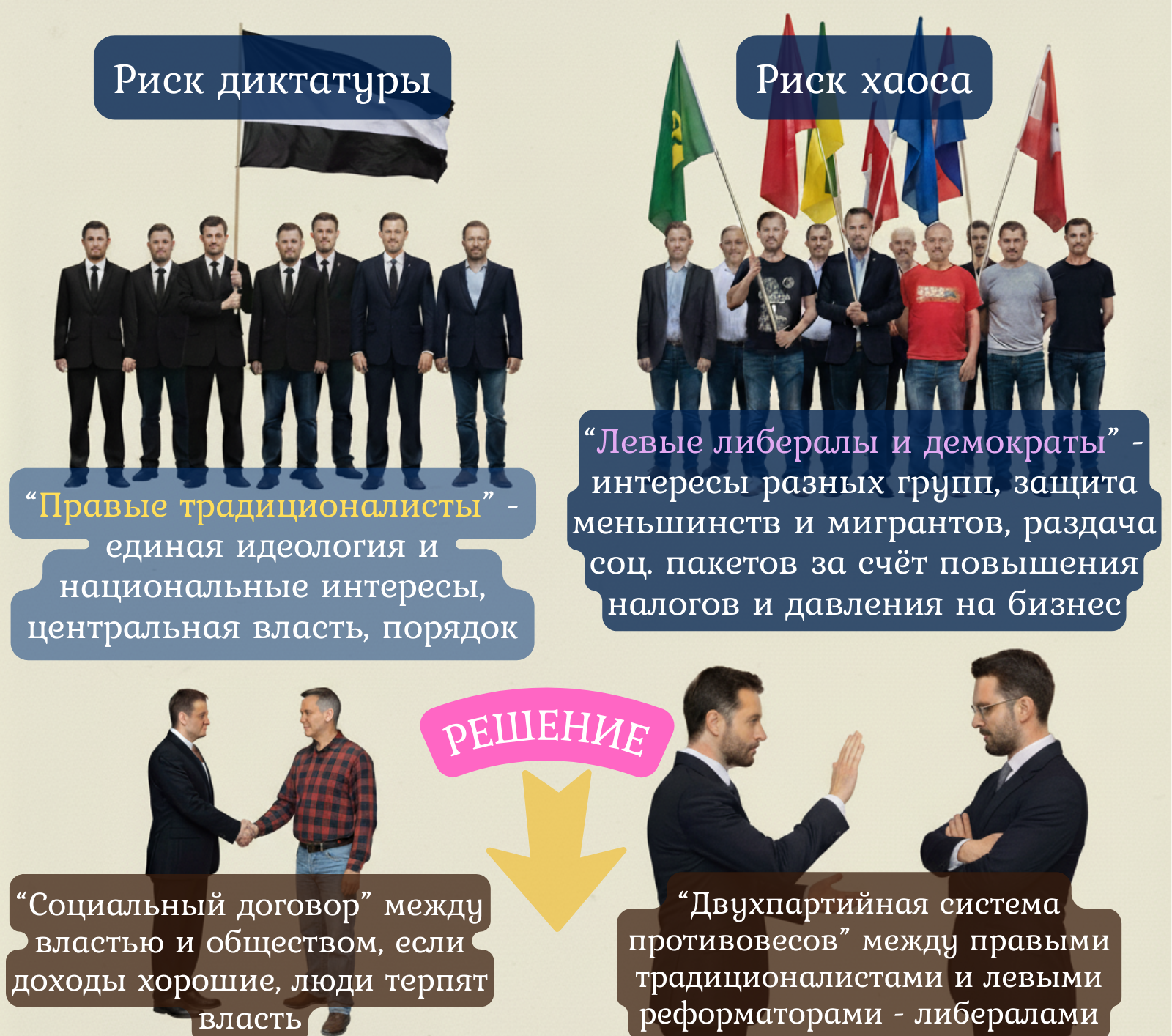 Ниже я сделал наглядную картинку разницы идеологий «правых» и «левых», которые периодически меняют друг друга. Демократы создают перекосы поддержкой малых групп, чрезмерной раздачей субсидий и повышением налогового бремени, а правые (традиционалисты и националисты) стараются навести порядк, с учётом национальных интересов нативного населения и бизнес-корпораций. И те и другие склонны к перегибам, одни заигрываются с разношёрстным электоратом, другие передавливают его жёсткой рукой.
